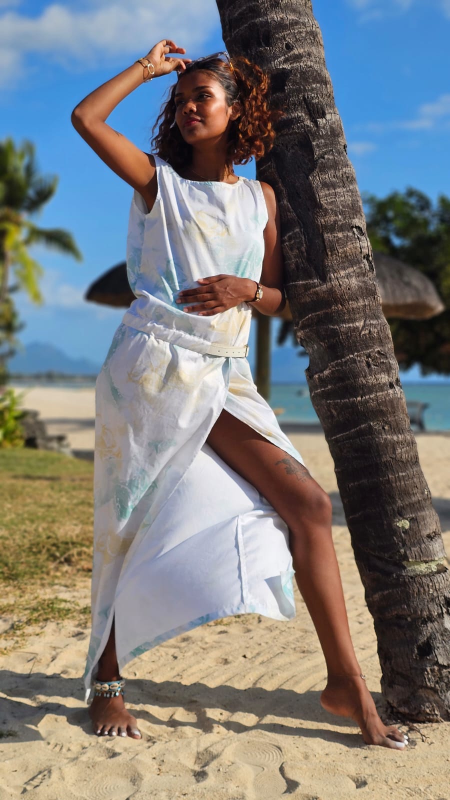 Breeze through your day in this soft 100% cotton maxi dress, designed for freedom and movement. Featuring a subtle watercolour print, a side slit for a hint of allure, and a flattering silhouette, it’s both playful and elegant. Comes with a matching belt to cinch the waist and define your shape. Perfect for tropical adventures and sunset dinners.